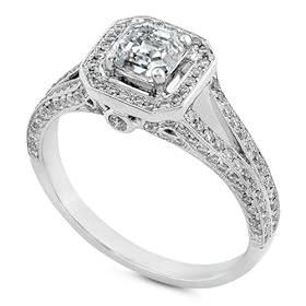 Product Description Crafted in 14k white gold, this gorgeous engagement ring features a 0.75ct Asscher cut diamond center accented by 142 Round Brilliant cut diamonds of HI color and SI clarity.