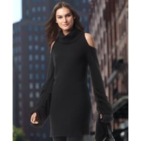 Sweater sexy! Make heads turn in this hot turtleneck sweater dress with cutout shoulders from DKNYC.