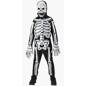 This glowing jumpsuit and gloves features a full body of 3-D molded bones and an 'Action Jaw' mask that cowls. It's sure to be the creepiest at the party when the lights go out. A great Halloween costume!