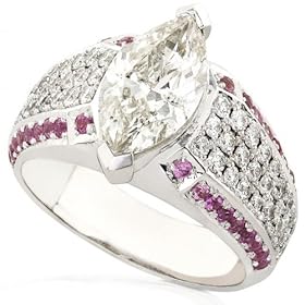 46 Round Brilliant Diamonds (1.00ct). 36 Pink Sapphires (0.50ct). Marquise-Cut Center Diamond (2.50ct). Setting: 15.50mm tall x 7.80mm deep. Taper: 10.60mm - 5.05mm wide.