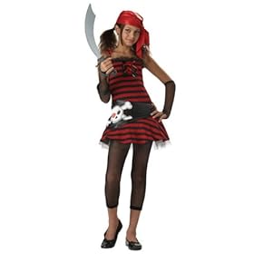 Tween Pirate Cutie Costume. Includes: red and black pirate dress, hip wrap with skull print, leggings, glovelettes and bandana. Comes in two tween sizes. Girls love to be pirates.